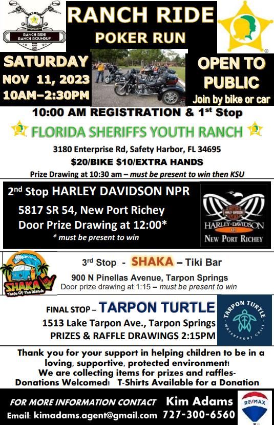 The run starts at the Florida Sheriffs Youth Ranch in Safety Harbor, Florida and ends at the Tarpon Turtle located in Tarpon Springs, Florida with a stop in between at New Port Richey Harley-Davidson.