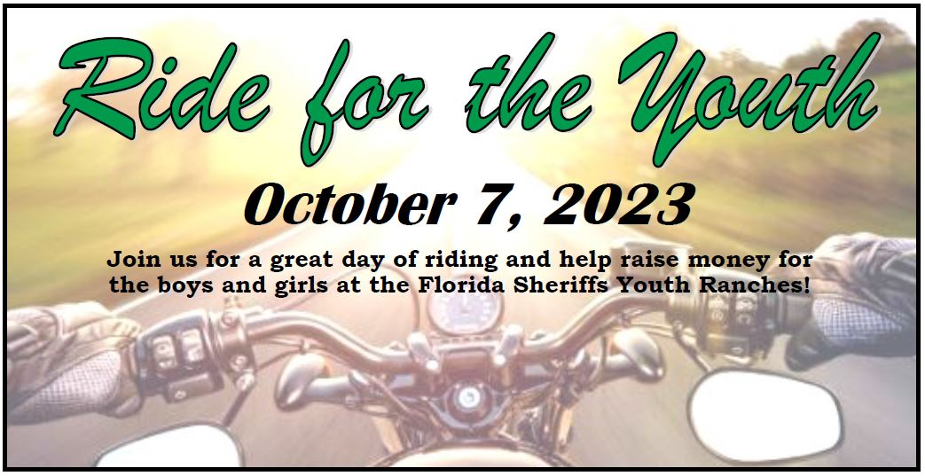 On October 7, 2023, join us for a great day of riding on a 100-mile route through Live Oak, Mayo, and Madison, Florida, ending at the Florida Sheriffs Boys Ranch.