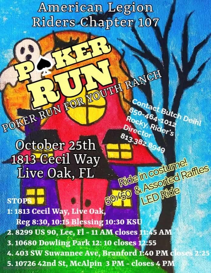 American Legion Riders Chapter 107 Poker Run for the Youth Ranch When: October 25, 2025 Where: First Stop: 1813 Cecil Webb Place Live Oak, Florida - Registration starts at 8:30AM, Blessing 10:15AM, Kickstands Up at 10:30AM Second Stop: 8299 US 90 Lee, Florida - 11:00AM closes at 11:45AM Third Stop: 10680 Dowling Park Dr - […]