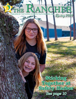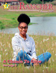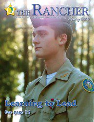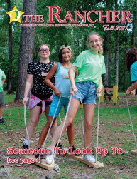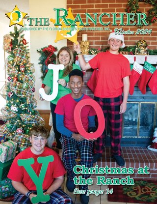 This is the cover of the 2023 Winter edition of the Rancher magazine. It depicts three girls having fun making decorations for a Christmas tree, They are stringing popcorn together and decorating pinecones.